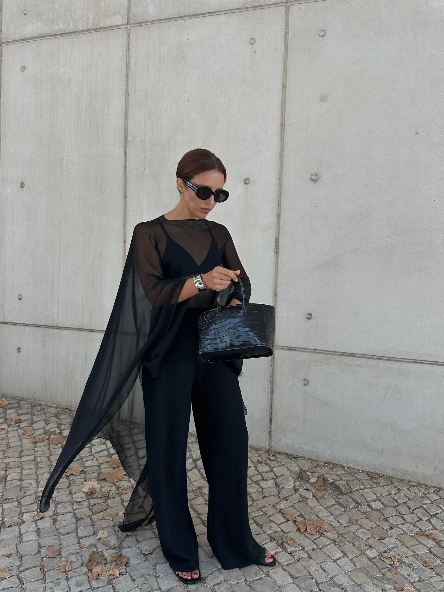Black remains the ultimate canvas for holiday dressing, but it’s all about the details. A sheer black overlay with wide-leg pants creates drama without feeling costume-y. The layered approach—a slip dress underneath, transparent duster on top—adds dimension and movement. Paired with structured accessories like that croc-embossed bag and cat-eye sunglasses, you’ve got a look that transitions seamlessly from afternoon gatherings to evening cocktails. The secret? Mixing textures and playing with proportions keeps black from feeling too basic or predictable.