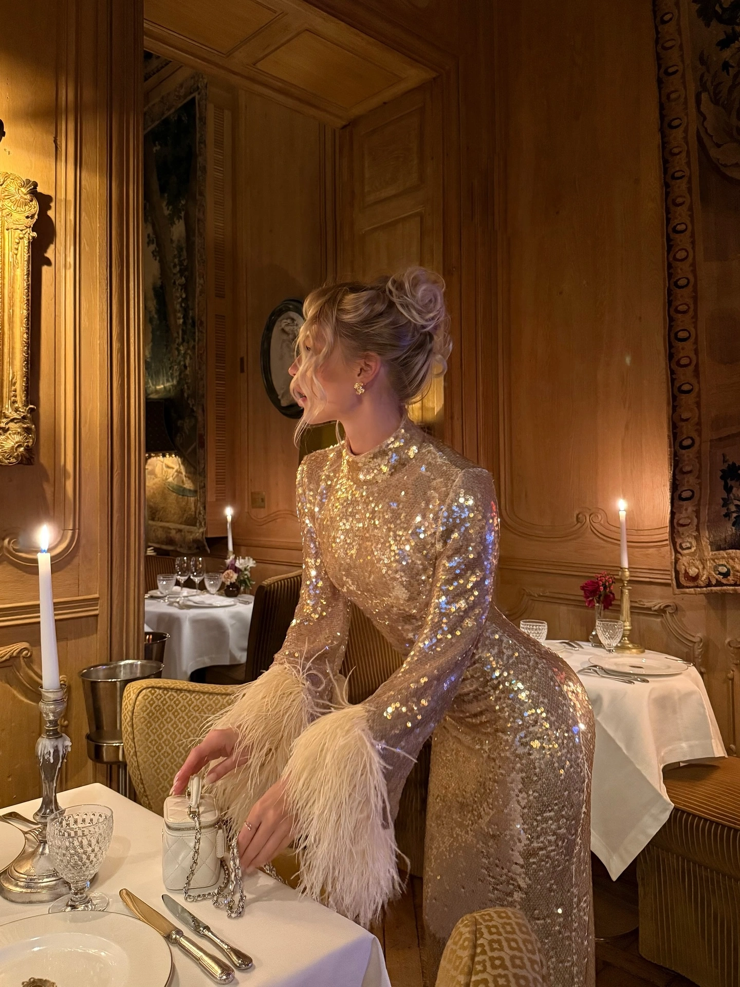 Maximalist glamour has its place at holiday parties, and this gold sequined gown with feather-trimmed sleeves and cuffs is pure magic. The high neckline keeps it sophisticated despite all that sparkle, and the updo hairstyle prevents the feathers from competing with the face. In that ornate dining room setting, this look feels right at home among crystal and candlelight. When you choose a statement piece this bold, the styling should be simple—notice how minimal the jewelry is. Let one element be the star.