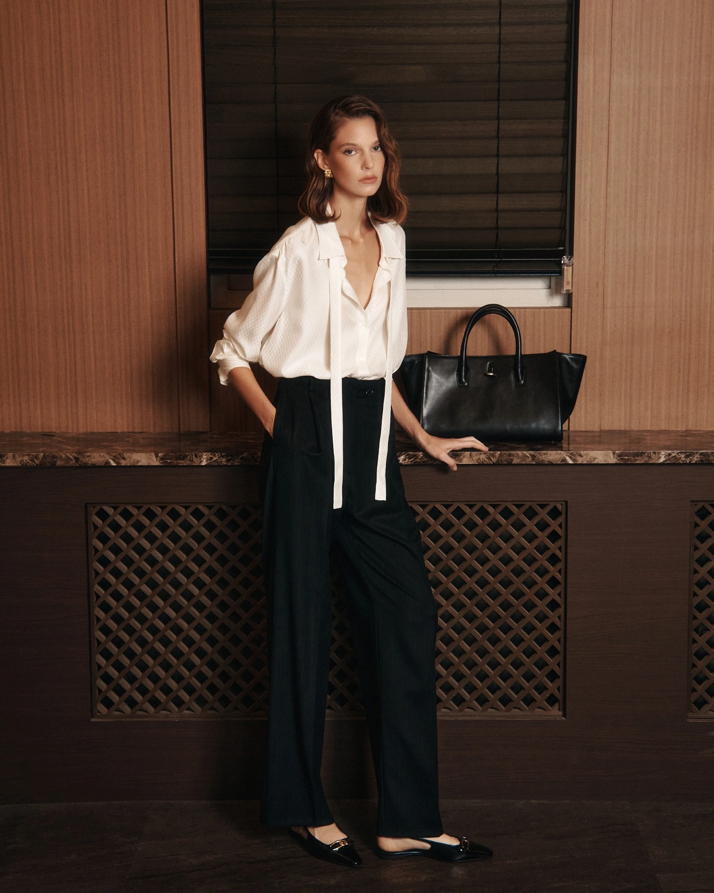 The tailored approach to holiday dressing deserves more attention. This ivory blouse with tie-neck detail paired with black wide-leg trousers and pointed flats creates a look that transitions seamlessly from office to evening . The oversized black tote grounds the outfit, making it feel practical and polished simultaneously. Against those warm wooden tones, this ensemble proves that sophistication doesn’t require high heels or bare shoulders. Sometimes the most elegant choice is the one that makes you feel powerful and comfortable in equal measure.