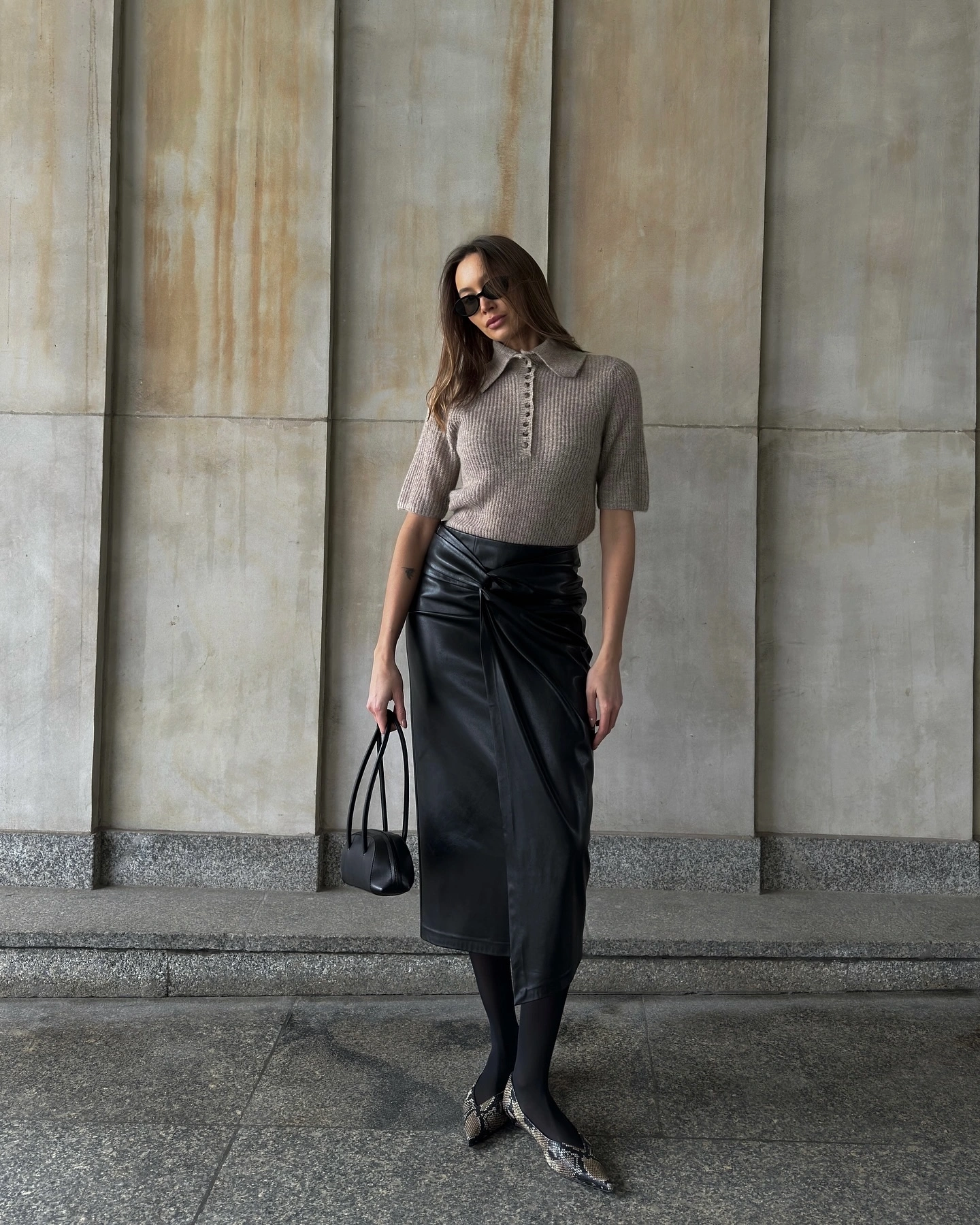 Leather never fails to add instant edge, and this ruched black leather midi skirt proves the point . Paired with a short-sleeved knit polo in taupe, the combination reads as refined downtown chic. Black tights and snakeskin-print slingbacks add texture without overwhelming the look. Standing against weathered columns, this outfit demonstrates how mixing materials—soft knit, smooth leather, patterned footwear—creates visual interest that holds up to minimal backgrounds. It’s perfect for those holiday events that straddle the line between casual and dressy.