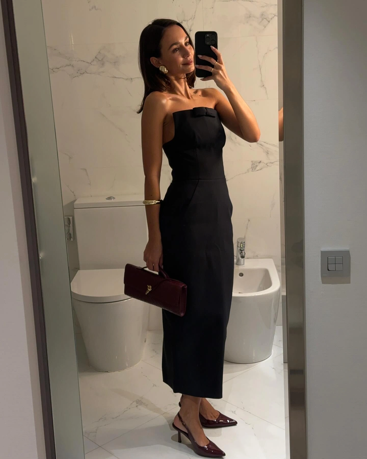 For the most elevated holiday occasions, a strapless black jumpsuit offers sleek sophistication. The cropped wide-leg silhouette feels fresh and modern, while the burgundy patent leather slingbacks and matching structured bag add a coordinated pop of color. That marble bathroom might seem like an unusual setting, but it highlights how truly versatile this outfit is—it works anywhere from gallery openings to holiday dinners. The gold cuff bracelet is the only jewelry needed; sometimes less really is more.