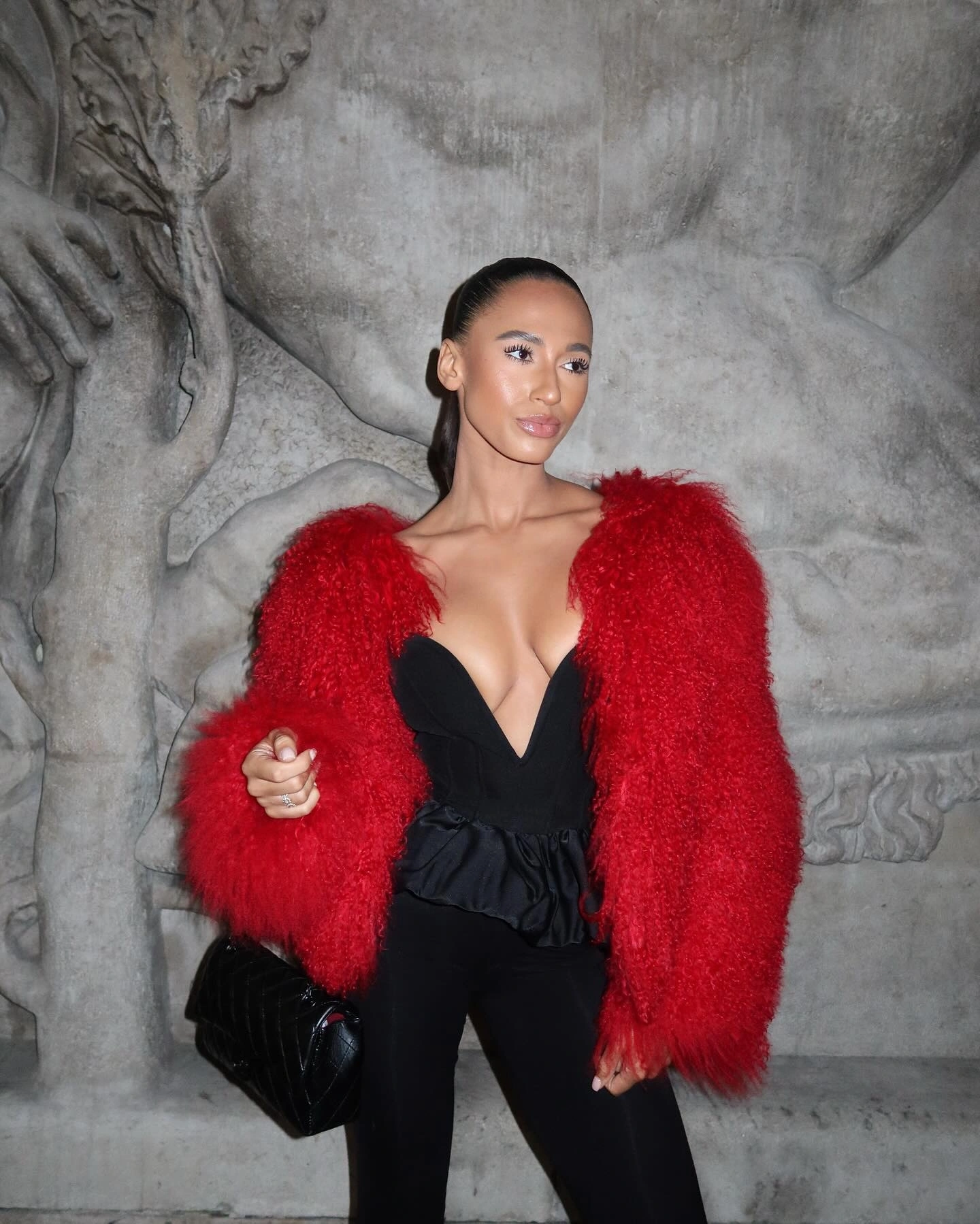 Textural contrast makes all the difference in cold-weather holiday dressing. This black bodysuit paired with fitted trousers becomes extraordinary when topped with a dramatic red shaggy coat . The deep V-neckline and bow detail on the bodysuit add feminine touches, while that incredible coat provides both warmth and serious visual impact. The quilted black bag keeps things grounded. Against sculptural stonework, this look demonstrates how outerwear can be the outfit—not just an afterthought, but the main event.