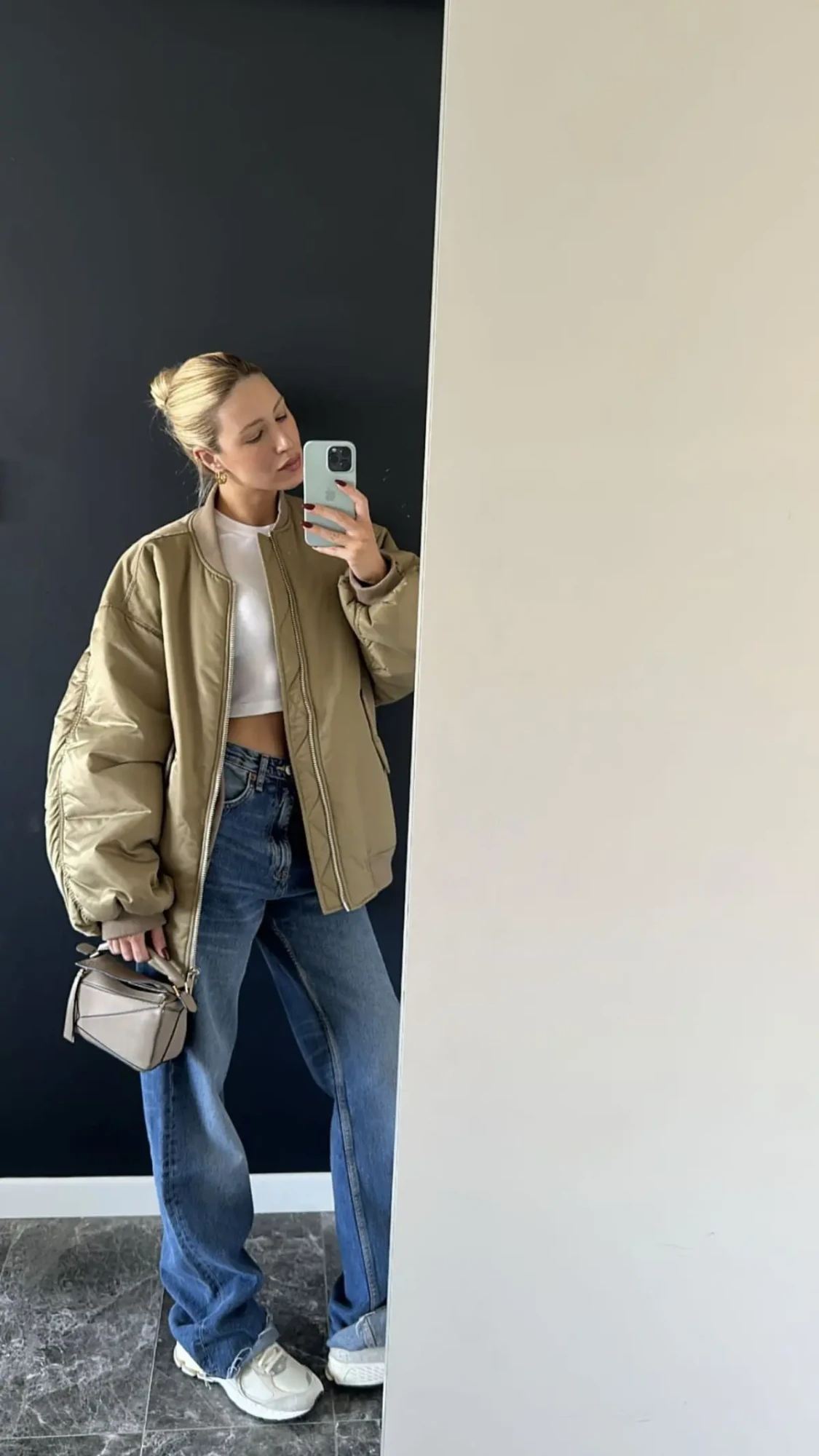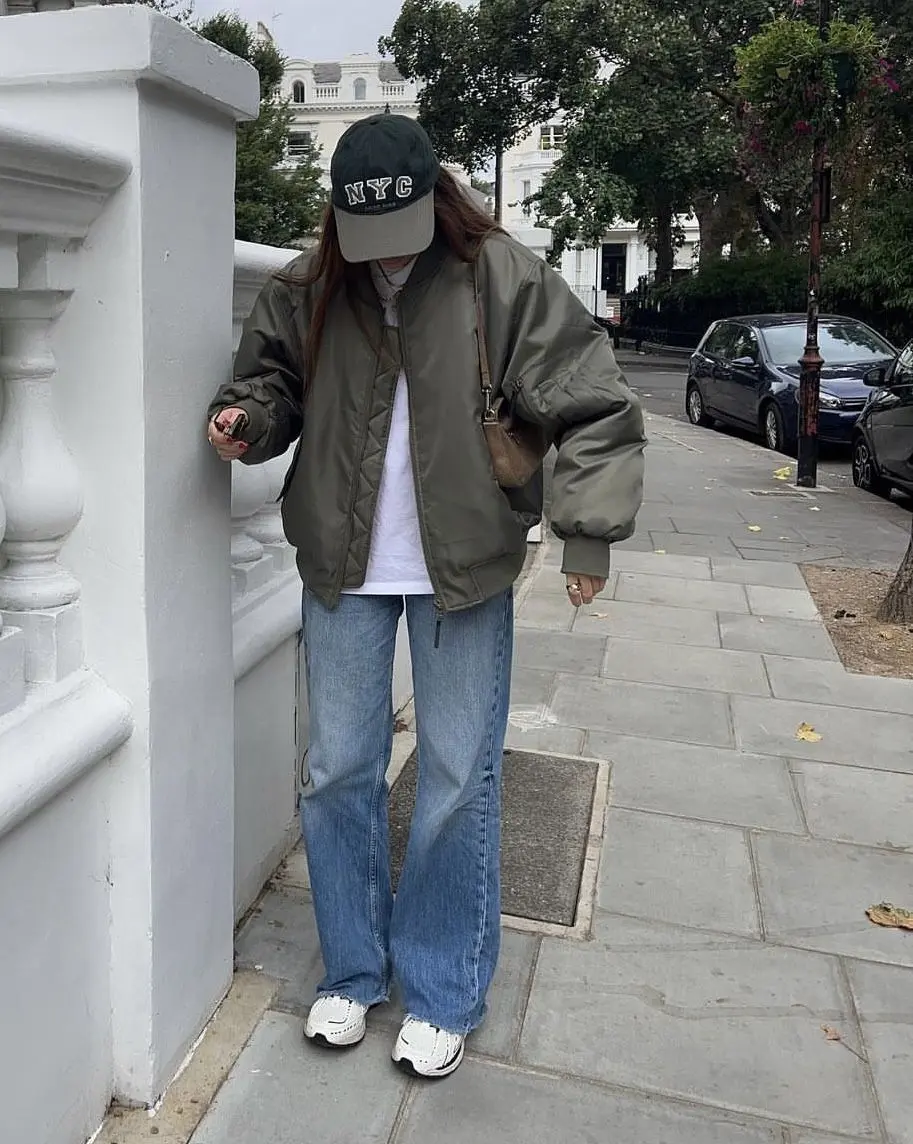 Key components: The oversized fit of the bomber is crucial here. It creates a relaxed silhouette that balances beautifully with the wider leg opening of the jeans. White chunky sneakers ground the look and keep it casual, while the NYC cap adds a sporty touch without going full athleisure.