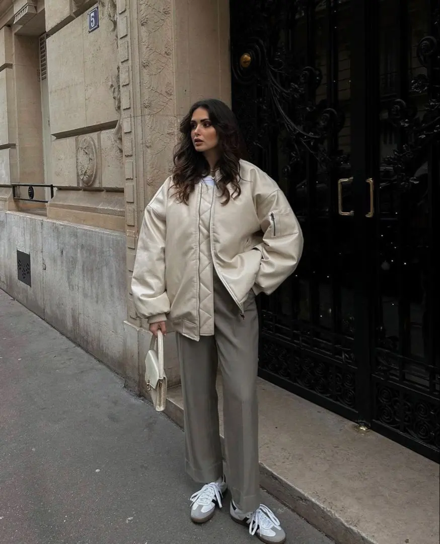 Styling tip: When going monochrome, play with different textures and fabrications to add depth. Notice how the satin-like finish of the bomber differs from the matte pants. This prevents the outfit from looking flat or one-dimensional. Learn more about creating sophisticated neutral outfits in our spring minimalist outfit guide.
