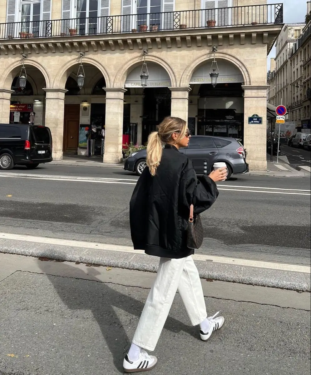 Key components: The contrast between the dark jacket and bright white pants creates instant visual interest. The classic Adidas sneakers with black stripes tie back to the jacket, creating a cohesive loop that your eye naturally follows. According to Town & Country’s spring jacket guide, black bombers remain a timeless investment piece.