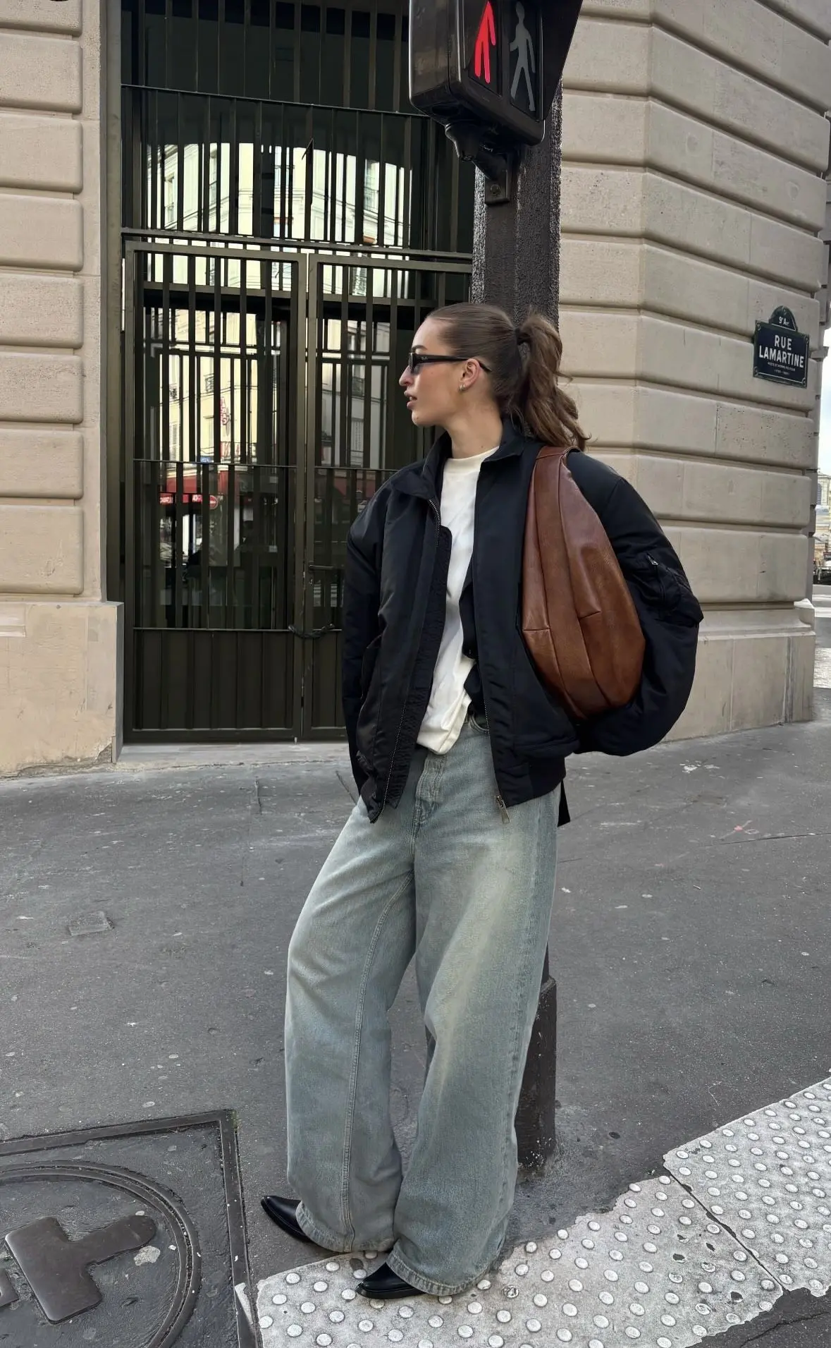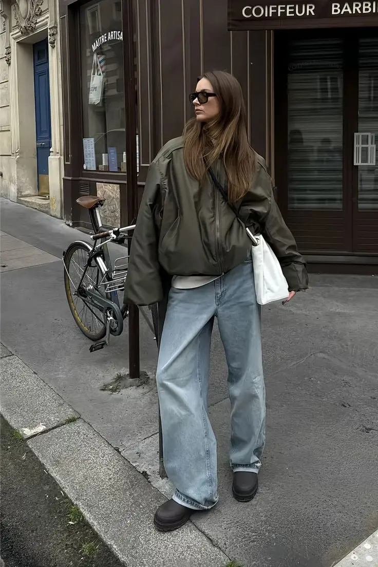 Key components: The key here is the proportions. The bomber is intentionally oversized, balanced by the wide-leg light-wash jeans and chunky platform shoes. The white shoulder bag adds a feminine touch, while the sunglasses complete the “too cool to care” vibe.