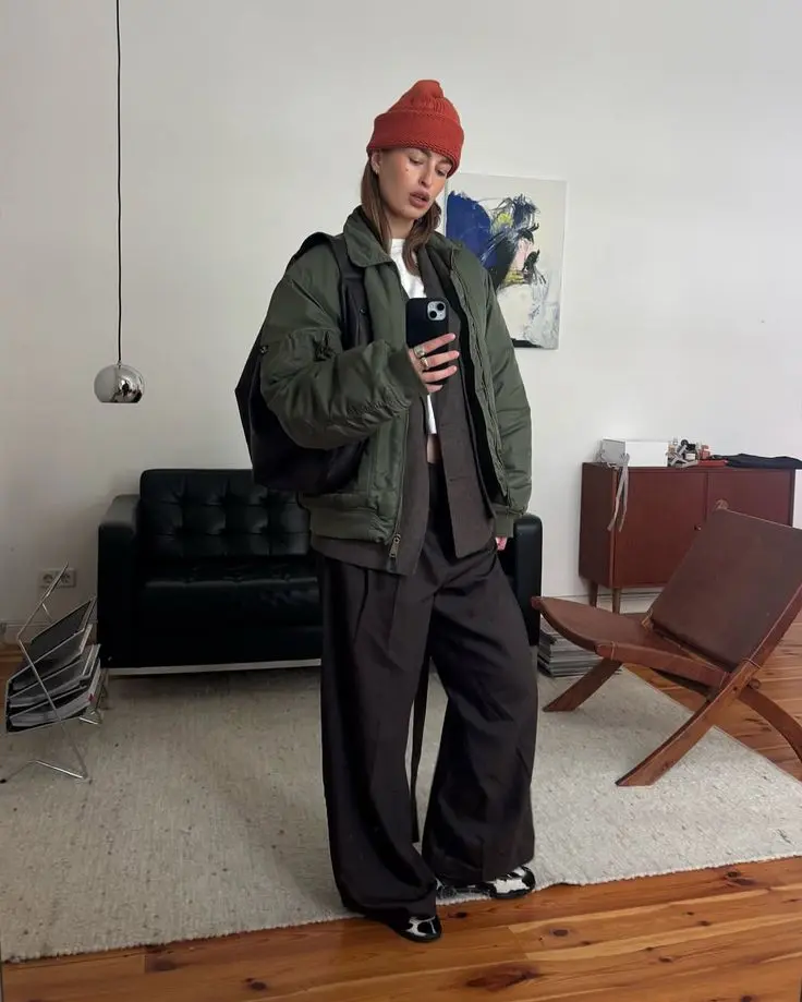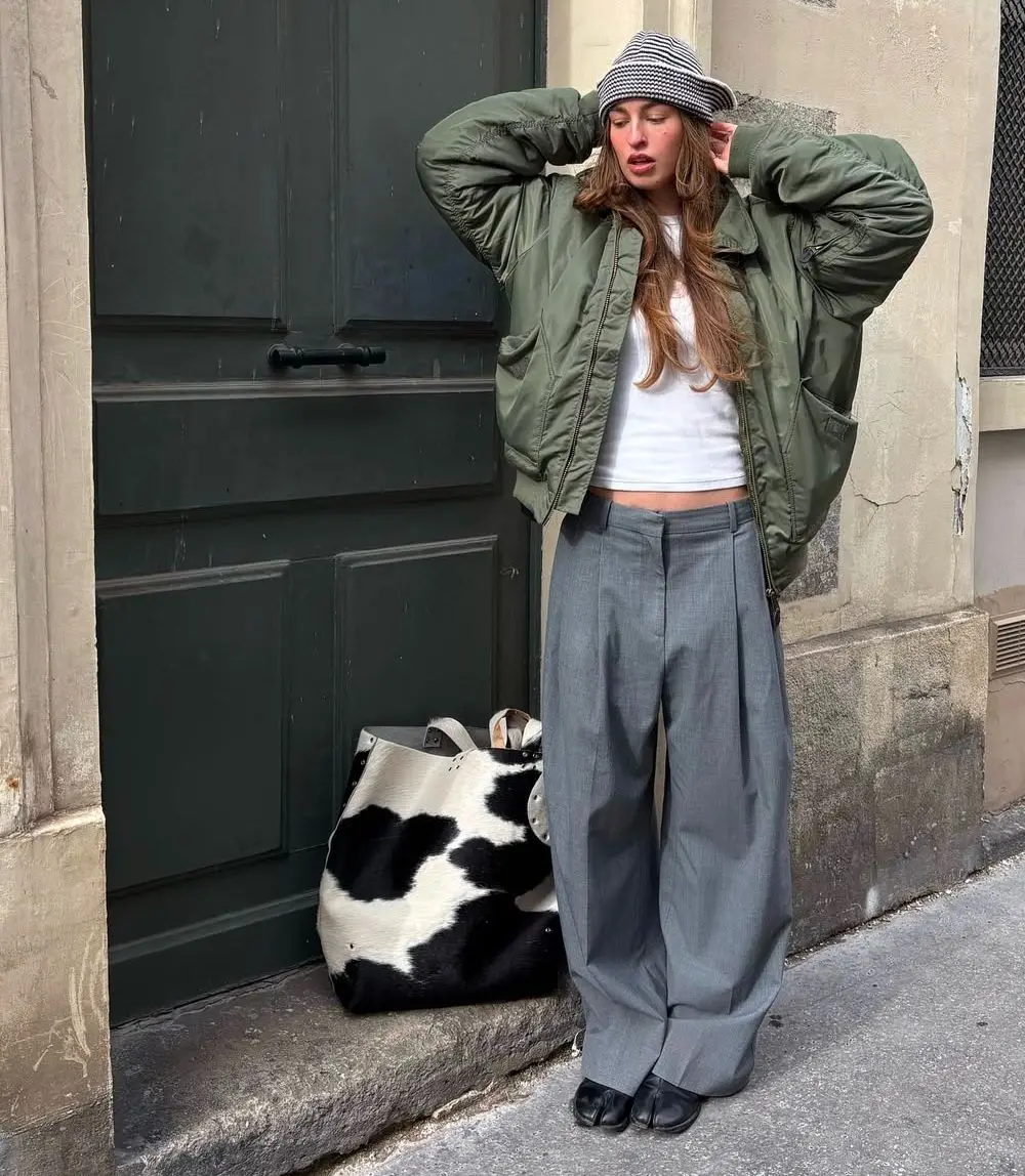 If you’re ready to experiment with proportions, this is your outfit. The massively oversized olive bomber paired with grey wide-leg trousers creates an intentionally exaggerated silhouette that feels very now.