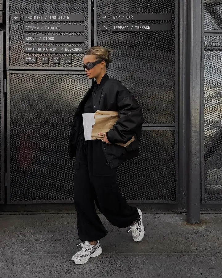 Key components: The all-black palette is grounded by white chunky sneakers, which provide necessary visual relief and keep the look from feeling too serious. The oversized sunglasses add a fashion-forward element, while the structured headband keeps hair neat and adds a sporty detail.