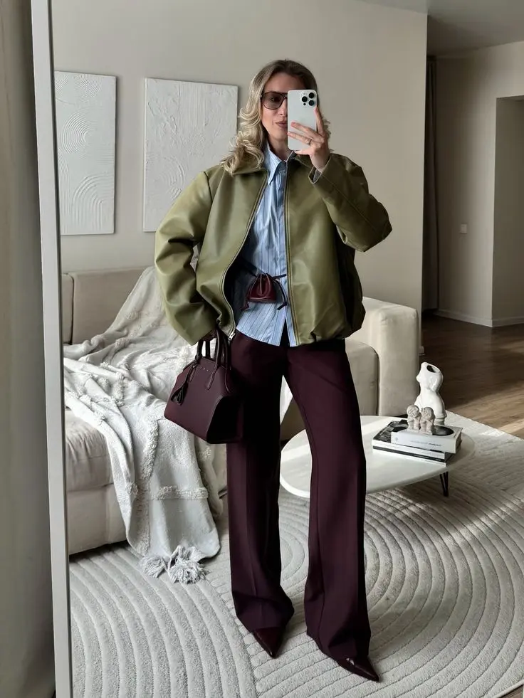 Who says you have to stick to neutrals? This outfit proves that a classic olive bomber works beautifully with unexpected colors like burgundy. The striped shirt adds pattern without competing with the rich color of the pants.