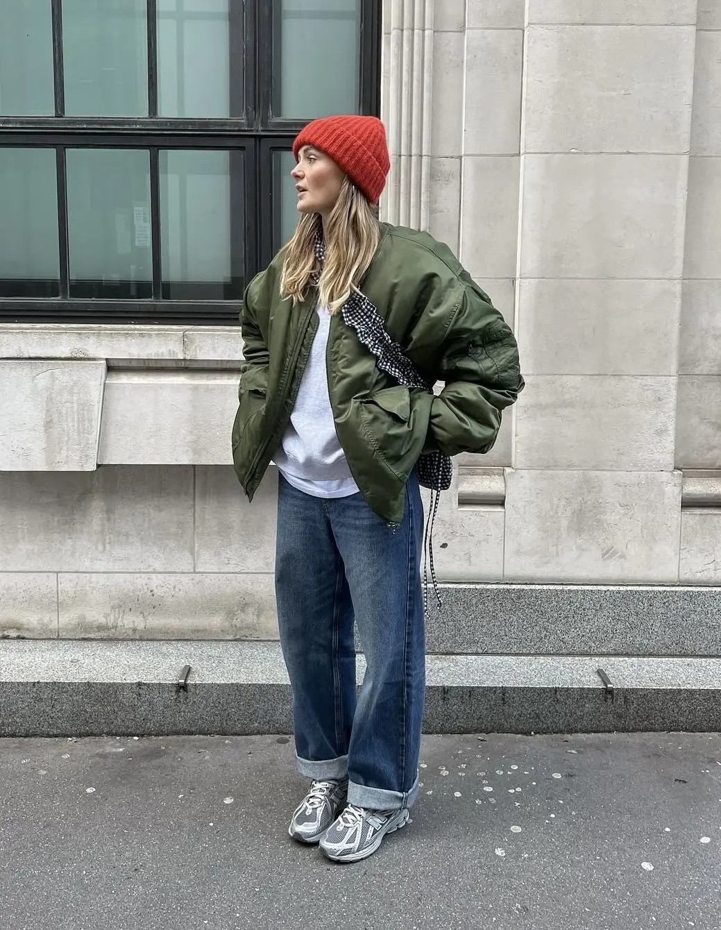 This is what I picture when I think of European street style—effortlessly cool, slightly oversized, perfectly undone. The olive bomber is sized up significantly, creating that coveted borrowed-from-the-boys aesthetic that’s everywhere right now.