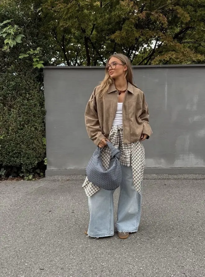 Key components: The suede texture instantly elevates this look, making it feel more refined than your standard sporty bomber. Paired with a striped button-down (instead of a plain tee) and light-wash wide-leg jeans, this outfit bridges the gap between casual and polished. The woven bag adds an organic, artisanal element.