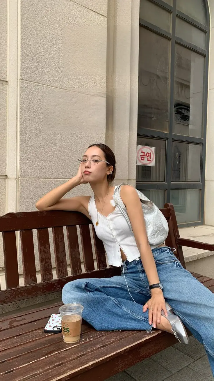 There’s something about this outfit that screams “Seoul coffee shop on a Saturday morning.” The white fitted button-front top paired with relaxed jeans creates that effortless balance ulzzang style is known for. What makes this work is the attention to accessories—the simple necklace, the coffee cup as a prop, and most importantly, those wire-frame glasses that add an intellectual, bookish charm.