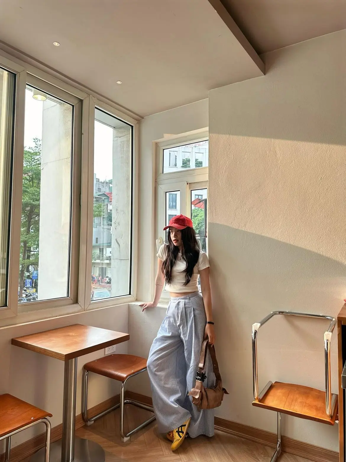 The oversized pink striped button-down is peak ulzzang—it looks borrowed from someone else’s closet in the best way possible. Paired with cream-colored wide-leg pants and white sneakers, this outfit strikes the perfect balance between polished and relaxed. The brown bag adds a sophisticated touch.