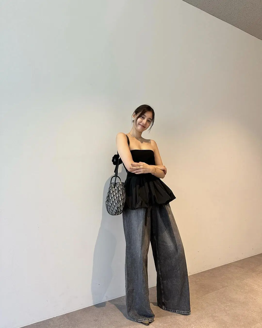 This is ulzzang style at its most fashion-forward. The black strapless top with a dramatic peplum detail paired with ultra-wide dark jeans creates a striking silhouette that’s both modern and romantic. The woven bag adds texture and a handmade quality that feels authentic to the aesthetic.