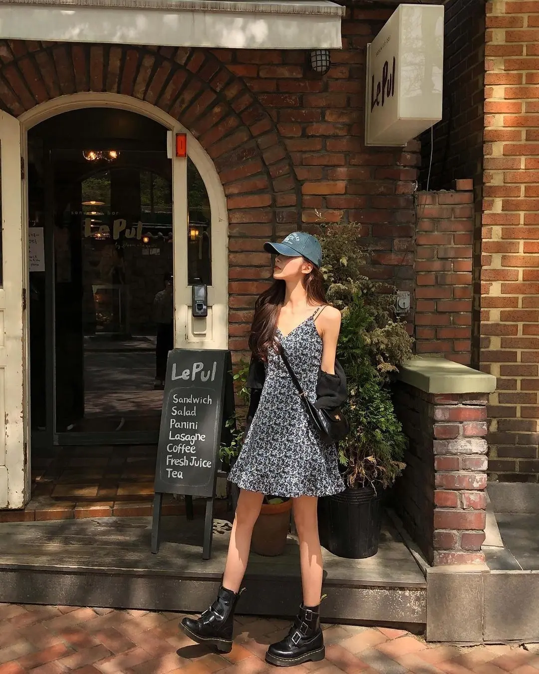 Floral dresses are a staple in ulzzang wardrobes, but what prevents this from looking too sweet is the styling. The denim baseball cap adds a sporty element, while the chunky buckle boots give it an edgy, almost grunge-inspired twist. The crossbody bag keeps things practical and age-appropriate.