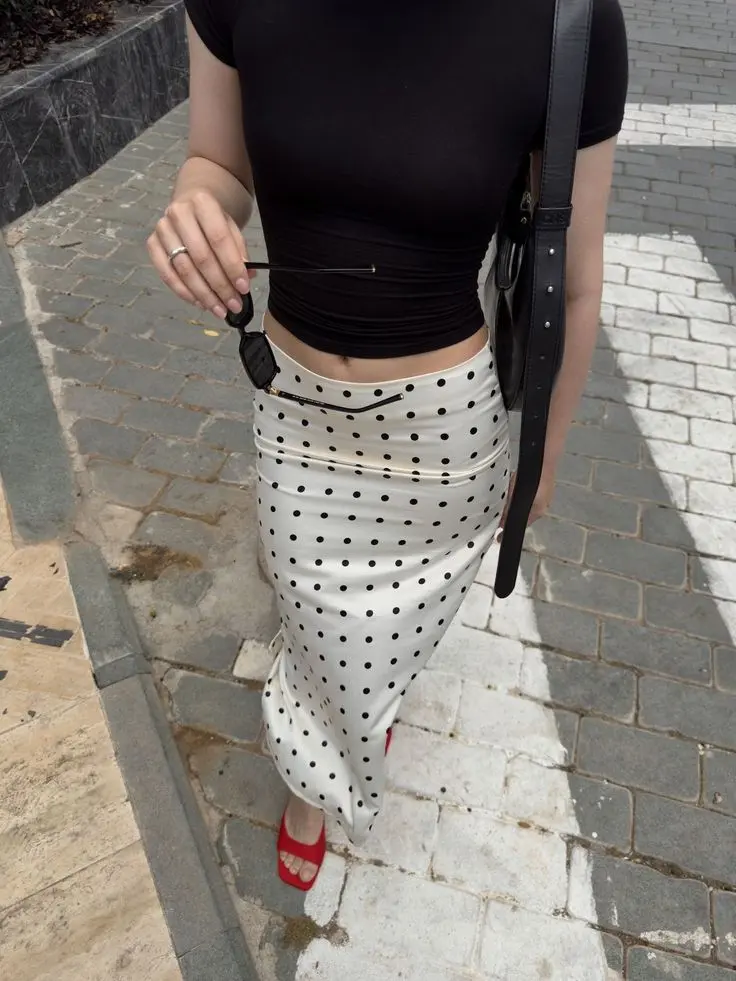 Polka Dot Perfection: High-Waist Midi Skirt + Black Top