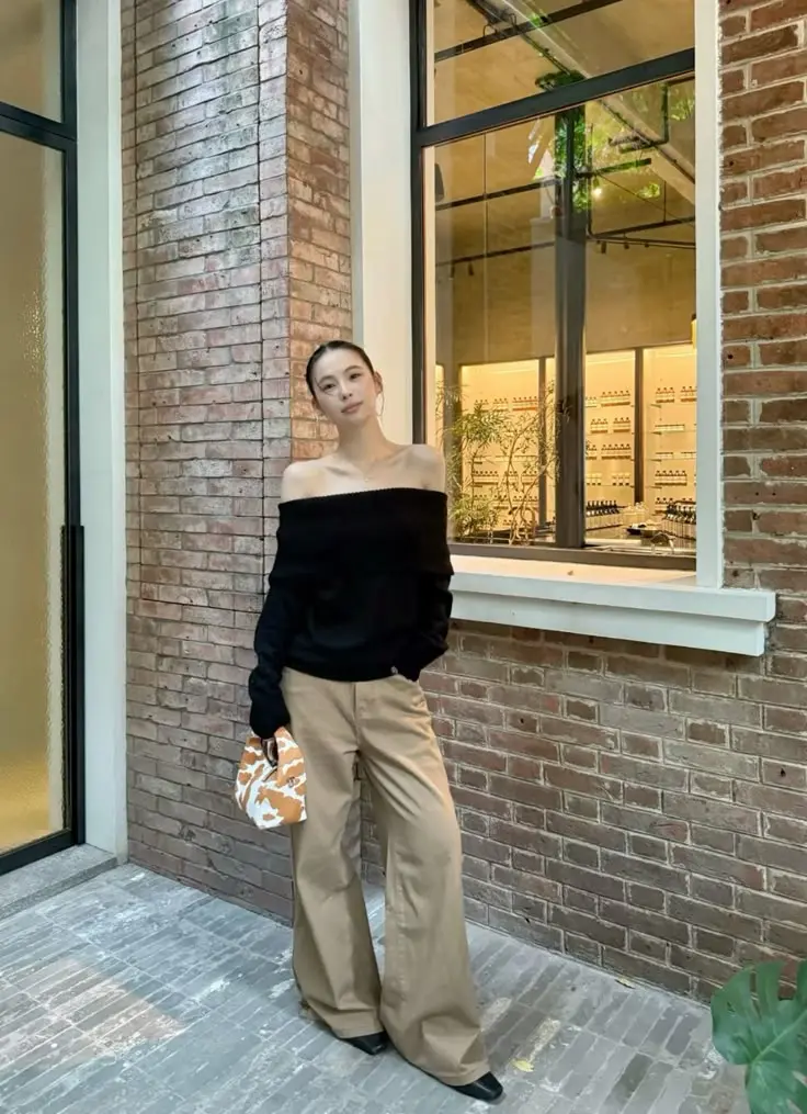 The off-shoulder black sweater paired with beige wide-leg pants shows how ulzzang style can feel relaxed yet intentional. The slicked-back bun and minimal accessories let the clothing speak for itself, while the simple bag adds a practical finishing touch.