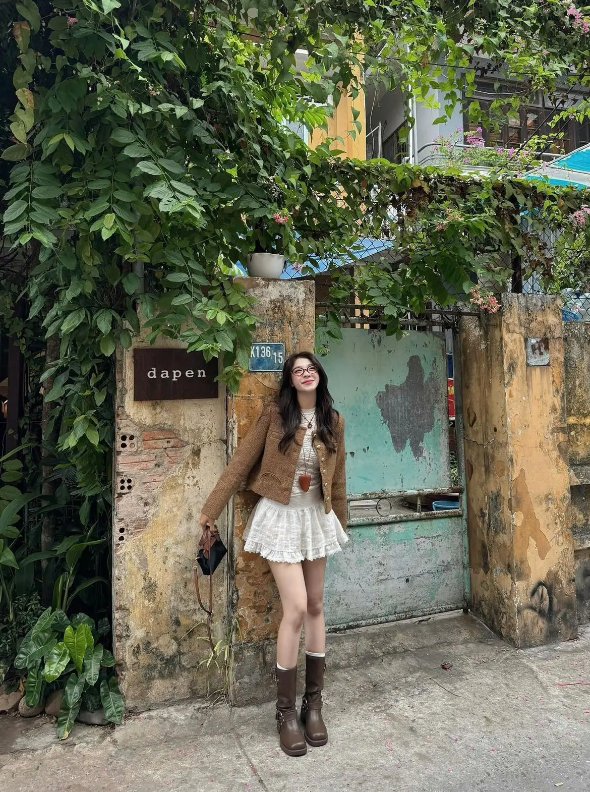 This outfit perfectly encapsulates why ulzzang style has taken over street fashion blogs worldwide. The tan jacket layered over a white shirt and white maxi skirt creates a soft, romantic silhouette, while the brown boots and simple braid keep it grounded and wearable. The brown leather bag adds a vintage touch.