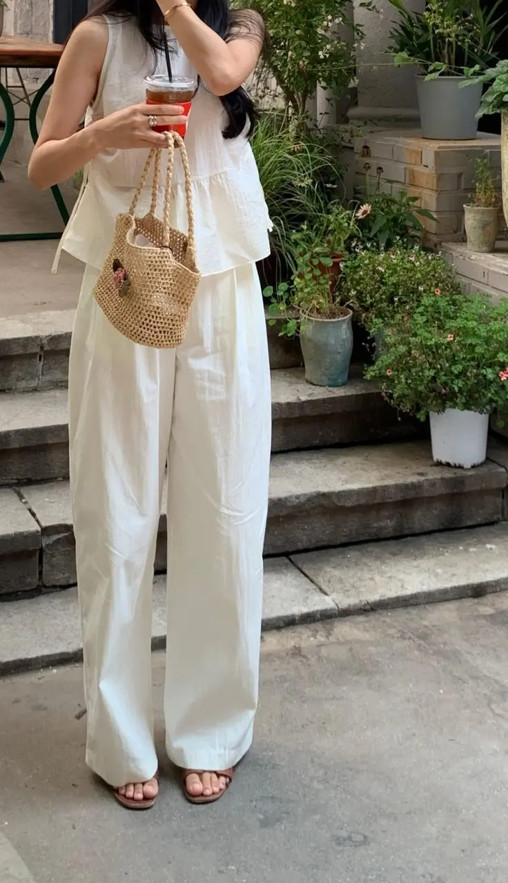 The white sleeveless peplum top with cream wide-leg pants is summer ulzzang perfection. The woven bag adds a beachy, vacation vibe while still feeling sophisticated. The all-neutral palette is calming and elegant.