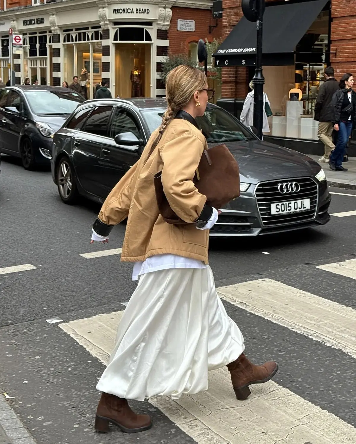 Styling tip: The jacket-shirt-maxi skirt combination is endlessly versatile and Instagram-ready. Here, keeping everything in warm neutrals creates a cohesive look that wouldn’t be out of place in Vogue’s street style coverage. The braid is practical but also adds to the soft, feminine vibe. When wearing a maxi skirt with boots, make sure the boots have some heel—it prevents the look from dragging you down visually.