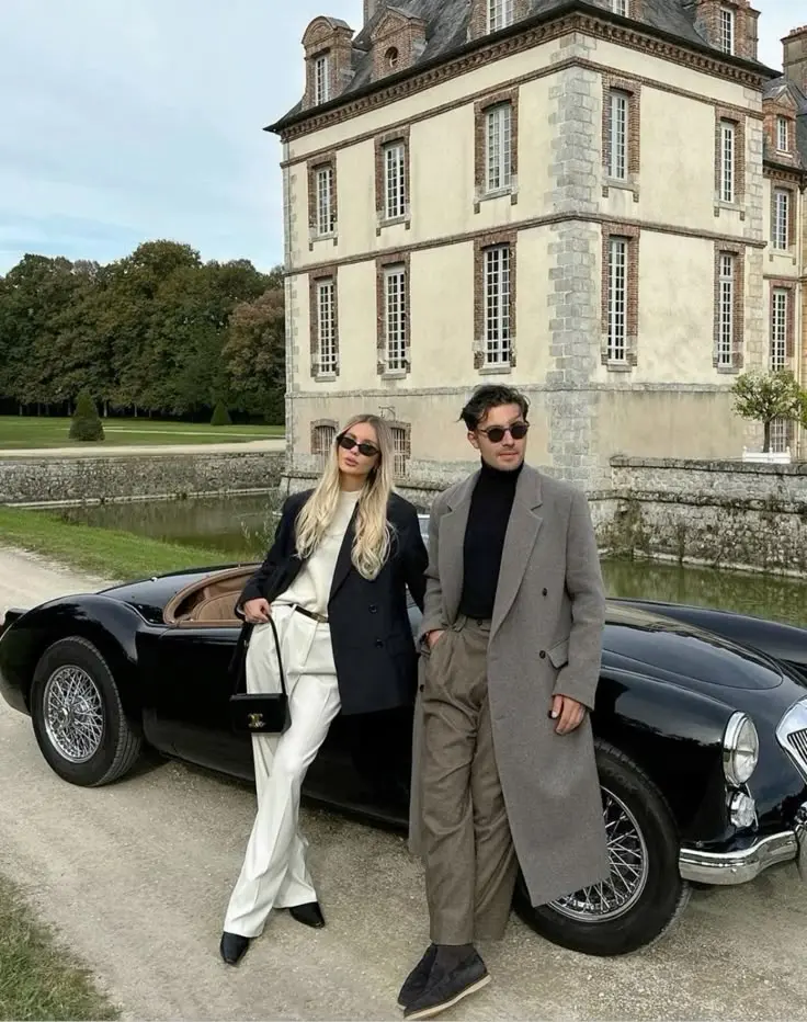 A stunning black and white coordination where she wears a black blazer with white wide-leg trousers and he sports a grey long coat with cream trousers, both in black turtlenecks. The vintage car backdrop adds timeless elegance to this sophisticated pairing.
