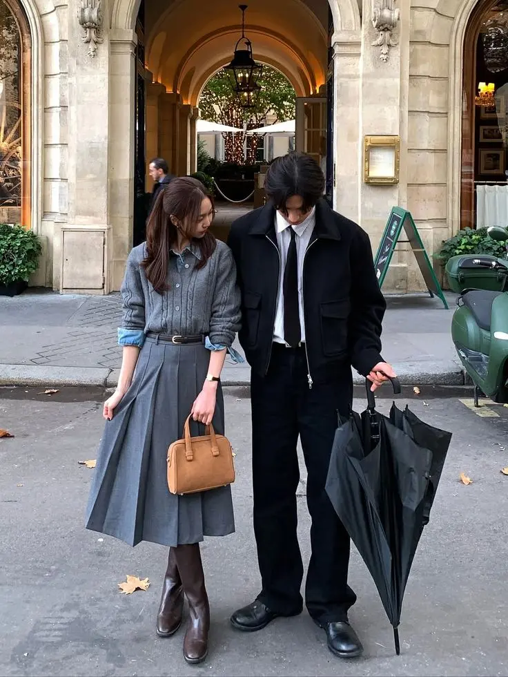 Styling Tips: Classic tailored coordination creates timeless, elegant photos that work for formal occasions or traditional engagement shoots. The shared formal aesthetic—structured coats, tailored bottoms, polished shoes—creates cohesion through styling approach rather than color matching. The grey and black palette with the Parisian backdrop creates romantic, timeless imagery. When coordinating for formal photoshoots, ensure both outfits are equally polished and dressy—mismatched formality levels look unintentional. This styling works beautifully for engagement photos, anniversary shoots, or formal couple portraits. European city settings, classic architecture, or elegant interiors enhance the sophisticated aesthetic. The key is both feeling comfortable in dressy clothing—if formal wear makes you stiff and uncomfortable, it will show in photos. Choose formal pieces you feel confident in, ensure everything fits impeccably, and the photos will reflect that polish and confidence.