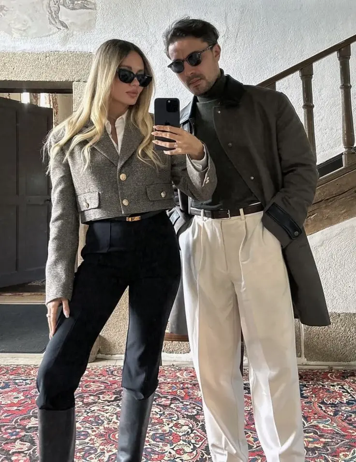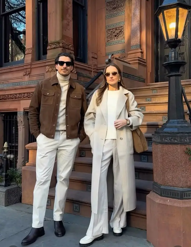 Styling Tips: Tonal dressing within the same neutral family creates incredibly sophisticated, editorial-quality photos. Both wear variations of cream, brown, and white, creating cohesion through color temperature rather than exact matching. The luxe fabrics—suede, wool, quality knits—elevate the looks and photograph beautifully. When coordinating tonally, choose fabrics with texture and weight for visual interest in photos. This approach works beautifully for engagement photos, anniversary shoots, or high-end couple portraits. Golden hour lighting enhances warm neutral palettes, creating glowing, romantic photos. Architectural backgrounds—classic buildings, elegant streets—complement the refined aesthetic. The key is both wearing similar levels of formality and polish so neither person looks over or underdressed relative to the other. This coordination feels luxurious without being stuffy, which translates to photos that look expensive and intentional.
