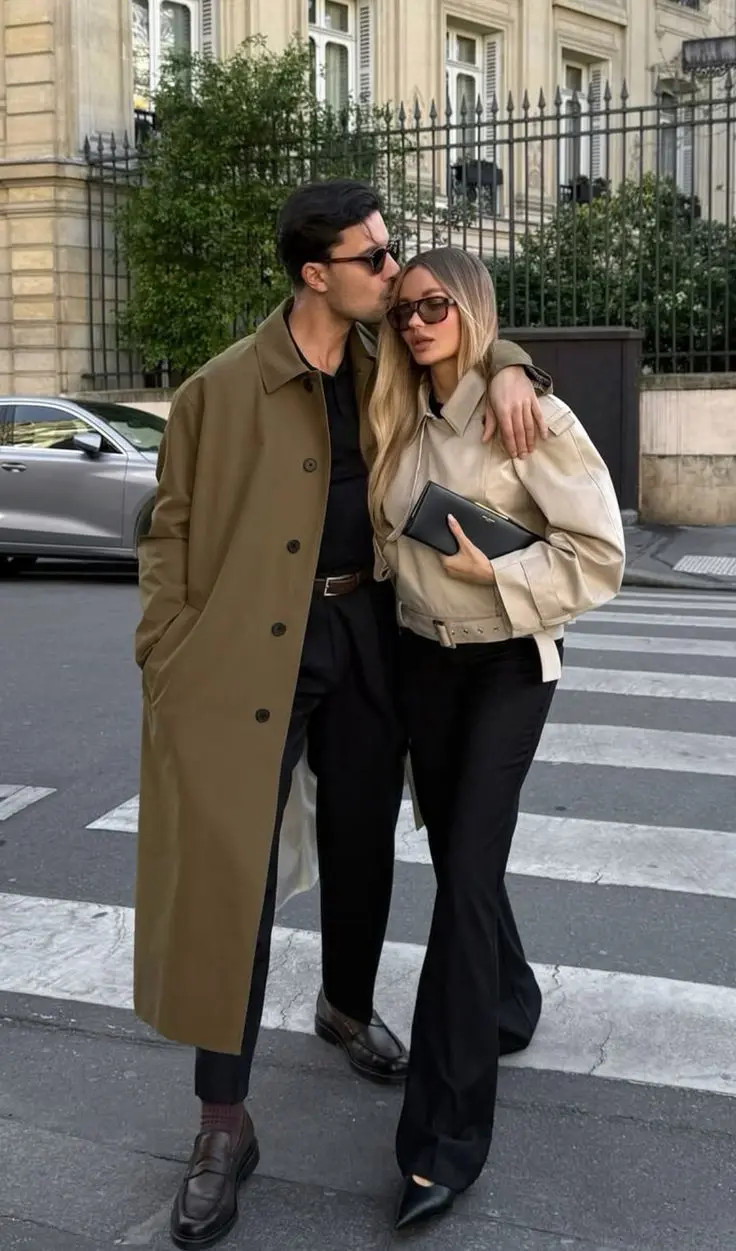 Styling Tips: Coordinating through complementary neutral outerwear is incredibly effective for spring and fall photoshoots. Both wear neutral jackets (her beige leather, his tan trench) over black basics, creating a unified palette that’s sophisticated and timeless. The similar styling approach—layered neutrals with black bottoms—makes the coordination feel natural rather than forced. This formula works beautifully for engagement photos, couple portraits, or lifestyle content. The beauty of this approach is its versatility—you can shoot in various locations and the outfits will always look appropriate and polished. When coordinating with neutrals and black, vary the textures (leather, wool, cotton) to add visual interest. Urban settings work beautifully with this aesthetic—city streets, cafes, architectural backgrounds. This coordination translates exceptionally well to photos because the neutral palette keeps focus on your faces and connection rather than loud clothing.