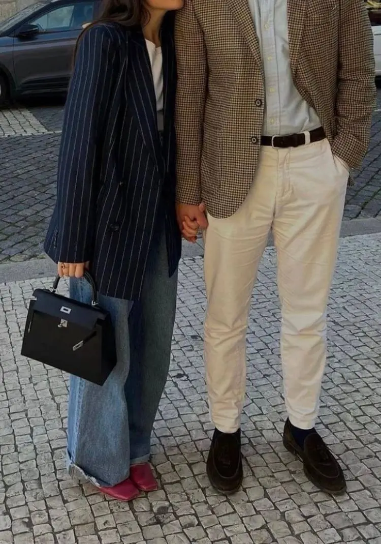 An interesting coordination featuring her in a navy pinstripe blazer with wide-leg jeans and him in a tan checked blazer with cream trousers. The shared tailored aesthetic and complementary patterns create visual interest while maintaining cohesion.