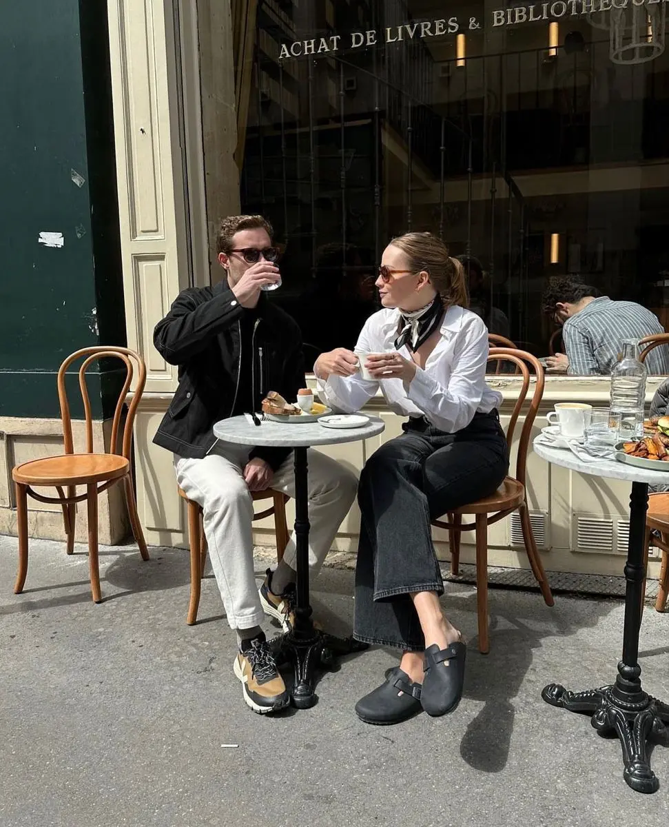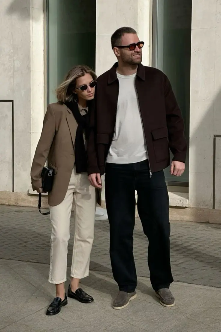 Styling Tips: Warm neutral coordination creates photos that feel intimate and timeless. The shared approach of pairing warm tones (tan, burgundy, cream) with black creates visual unity while allowing individual expression. Both wear similar shoe styles (loafers), which adds another subtle coordinating element. This palette is incredibly flattering in photos and works across various lighting conditions. When coordinating with warm neutrals, ensure both people’s undertones are in the same family—all warm or all cool—for the most cohesive results. This styling works beautifully for autumn photoshoots, engagement photos, or anniversary shoots. The relaxed, classic styling means these photos won’t look dated in years. European street settings, cafe backgrounds, or golden hour outdoor shots enhance the warm, romantic feeling of this palette. The key is both looking polished but comfortable, which translates to more natural, authentic photos.