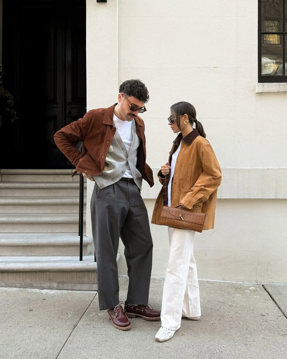 Styling Tips: Earth tone coordination creates warm, inviting photos that feel authentic and comfortable. The palette of browns, tans, creams, and greys all work harmoniously because they’re from the same warm neutral family. This approach is perfect for autumn and winter photoshoots or for couples who want a softer, more approachable aesthetic than stark black and white. The suede and knit textures add richness and depth to photos. When coordinating with earth tones, ensure the undertones match—all warm browns work together, but mixing warm and cool browns can look disjointed. This styling works beautifully for outdoor photoshoots, urban exploration, or lifestyle content. The casual, comfortable styling means you can actually enjoy the photoshoot rather than feeling stiff or uncomfortable. White architectural backgrounds provide beautiful contrast to warm earth tones, making both the clothing and subjects pop in photos.