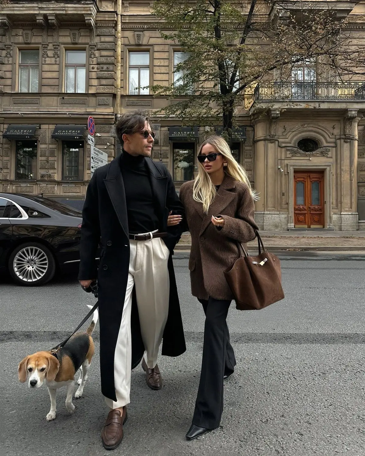 Styling Tips: Coordinating through texture and warmth rather than exact color creates photos that feel authentic and cozy. The shared brown tones (her sweater, his shoes and bag, his coat details) create subtle connection while the different silhouettes maintain individuality. The mix of black, brown, and cream is classic and photographs beautifully. When coordinating for autumn photoshoots, incorporate cozy textures like knits, wool, and leather that add warmth to images. This styling works perfectly for outdoor autumn shoots, city streets with fall foliage, or lifestyle content. The presence of their dog adds personality and makes the photos feel more like capturing a real moment than a staged shoot. The key is both looking comfortable and natural—overly posed photos never feel as authentic as ones where you’re genuinely relaxed in your outfits.