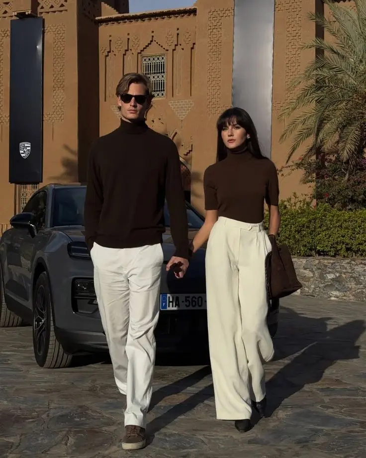 Styling Tips: Sometimes intentional matching creates the strongest visual impact. This bold approach—both in brown turtlenecks and white trousers—works because it’s so deliberate that it becomes a stylistic choice rather than looking accidentally matchy. The identical silhouettes create symmetry that’s visually striking in photos. This approach works best for modern, minimalist, or editorial-style photoshoots where you want a bold statement. When going for this level of coordination, ensure the fit and proportions are equally polished on both people—sloppy execution ruins the intentional effect. The golden hour lighting and architectural setting enhance the warm brown and white palette. This works beautifully for engagement announcements, editorial couple portraits, or content where you want visual impact. The key is committing fully to the coordination—half-hearted matching looks accidental, while deliberate matching looks intentional and stylish.