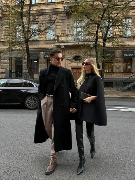 Styling Tips: All-black coordination is incredibly powerful and creates dramatic, striking photos. The key to preventing it from looking flat is varying textures and silhouettes—her cape coat versus his traditional wool coat, different pant styles, varied layering. All-black works in any setting and any season, making it incredibly versatile. The drama and sophistication translate beautifully to photos, especially in urban settings or architectural backgrounds. When both wearing all black, pay attention to fit and tailoring—everything should be impeccably fitted since there are no colors or patterns to distract from the silhouettes. This coordination works beautifully for winter photoshoots, evening shoots, urban exploration, or edgy engagement photos. The monochrome approach keeps absolute focus on your faces and connection. All-black photographs exceptionally well in various lighting conditions and looks timeless—these photos won’t look dated in decades.