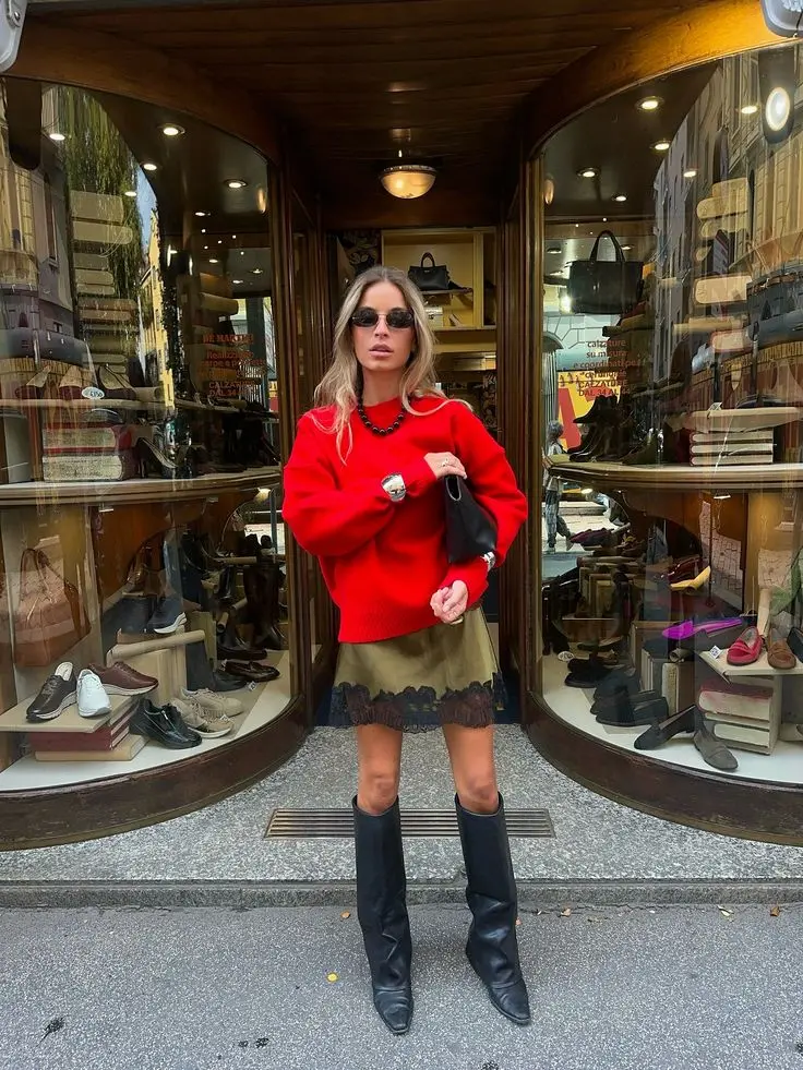 This outfit demonstrates the Parisian approach to color—use it sparingly but confidently. A vibrant red sweater becomes the focal point, paired with an olive-toned skirt featuring delicate lace trim that adds feminine detail. Black knee-high boots ground the look with Parisian practicality, while the small black bag keeps everything streamlined.