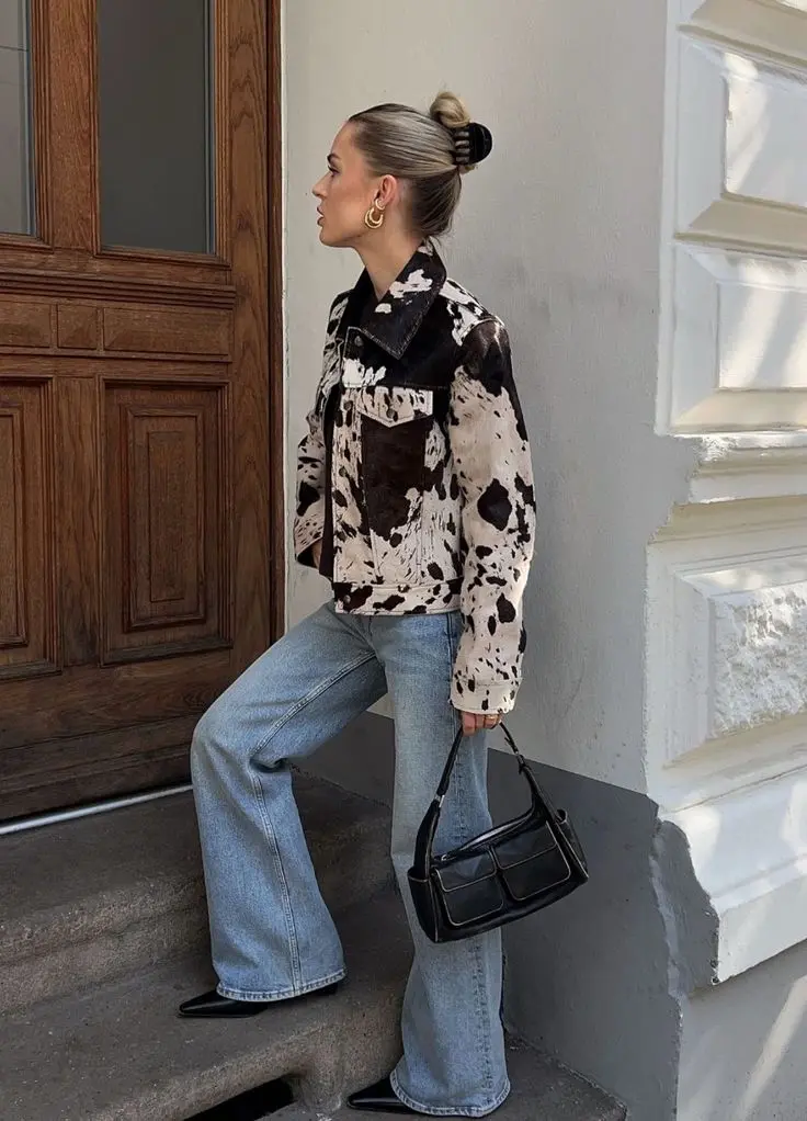 Parisians love a good statement jacket, and this cow print number proves that you can embrace bold patterns while maintaining that effortless aesthetic. The key is pairing it with the most classic piece in your wardrobe—blue jeans. The relaxed flare silhouette feels current, while black boots and a structured bag keep everything grounded.