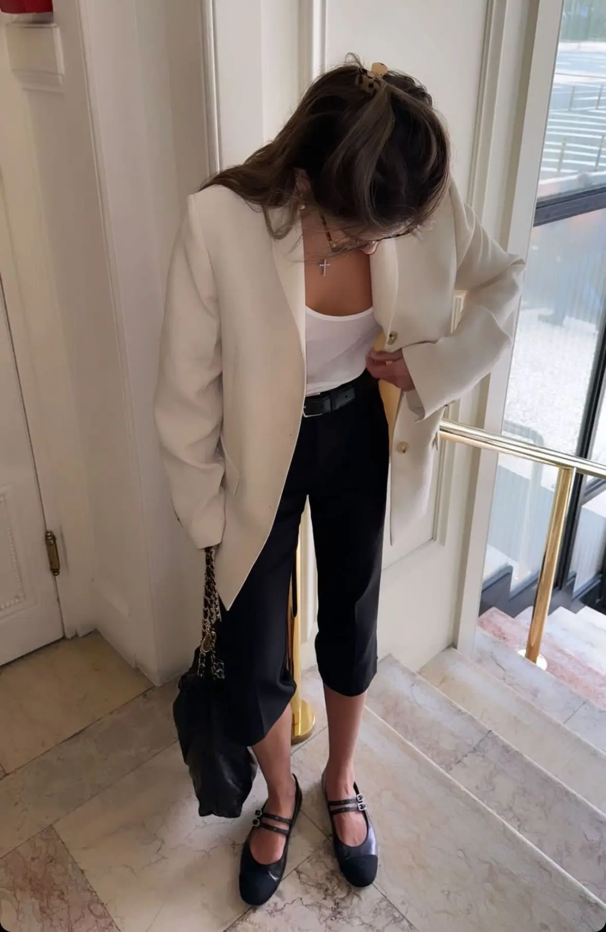 Styling Tip: The white-on-white-with-black combination is timeless and incredibly versatile. The slightly cropped pants show off the Mary Jane details—a very French styling choice that draws attention to footwear. This outfit transitions seamlessly from day to evening, making it perfect for packed Paris itineraries. Add a delicate necklace peeking out from the blazer for subtle jewelry impact.