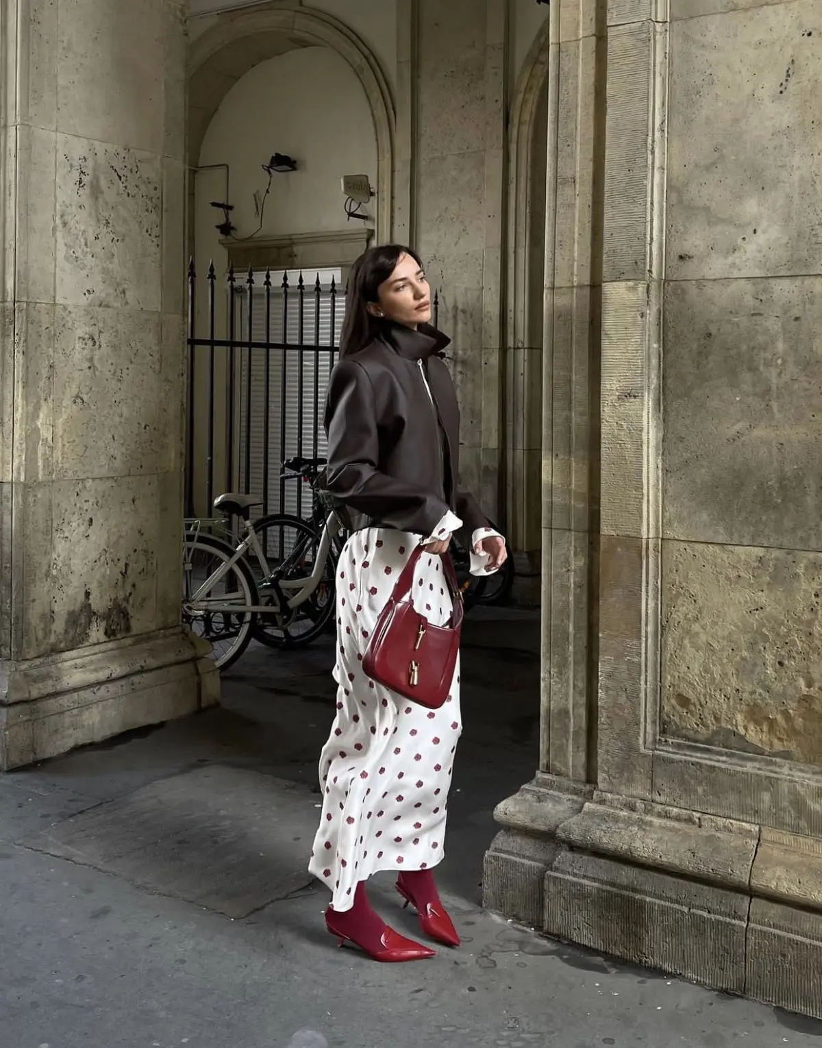 Parisians are masters at high-low mixing, and this outfit is a perfect example. A brown leather jacket provides comfort and ease, while a white polka dot midi skirt adds playful femininity. Red boots and a matching red bag create cohesive color moments that feel intentional rather than matchy-matchy.
