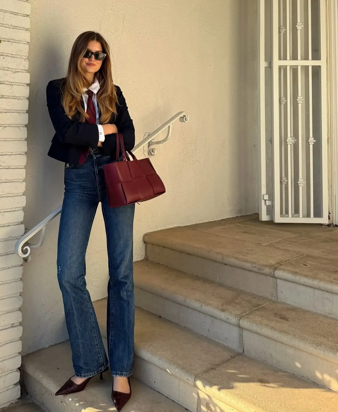 This look showcases the Parisian love affair with navy and burgundy—a color combination that feels both sophisticated and approachable. A navy blazer creates structure over a white shirt, while the burgundy tie adds a pop of color that’s echoed in the bag and shoes. Classic blue jeans keep everything grounded and wearable.