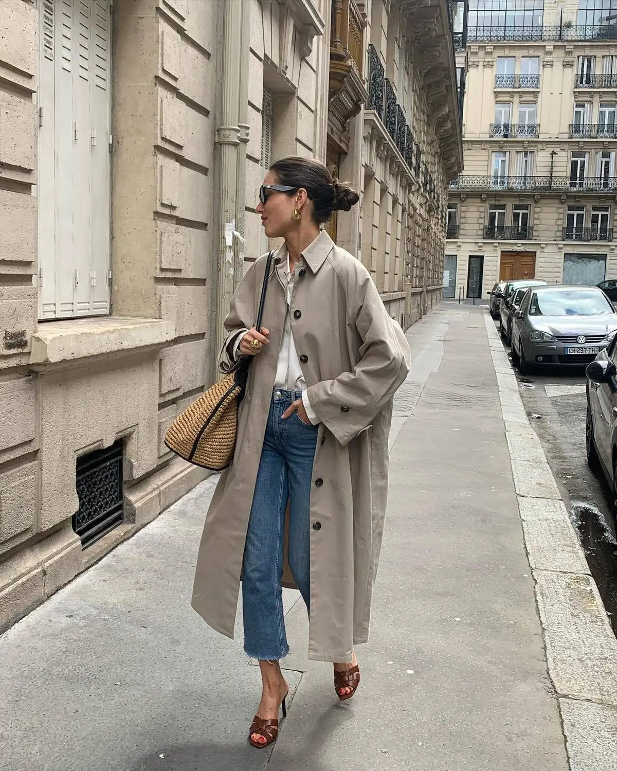 If there’s one piece that screams Parisian spring, it’s a beige trench coat. This outfit shows how to style it for casual elegance—over a simple white shirt and blue straight-leg jeans. Brown woven sandals with a slight heel add seasonal warmth, while the straw bag brings textural interest and practicality.