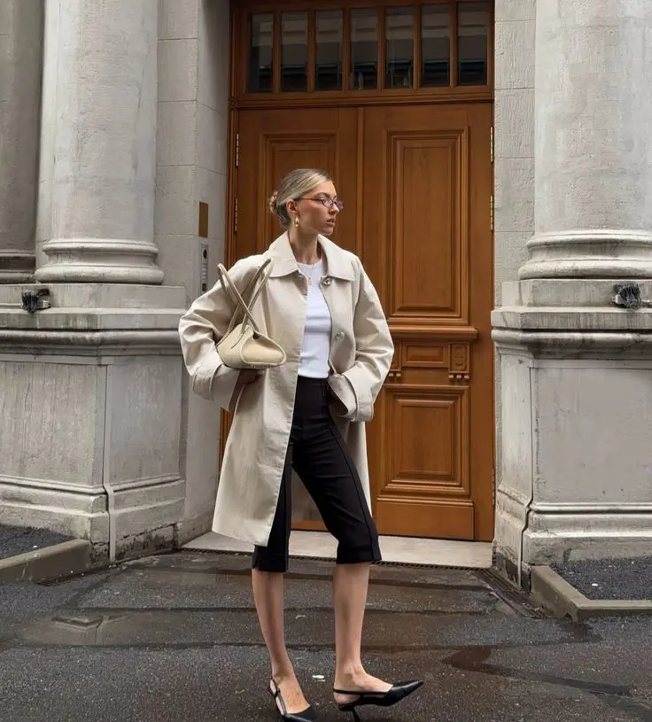 This outfit showcases the power of a neutral palette. A cream trench coat provides that essential Parisian layer, worn over a white top and black shorts. Black slingback flats complete the classic color scheme while remaining practical for all-day wear. The overall effect is timelessly chic.