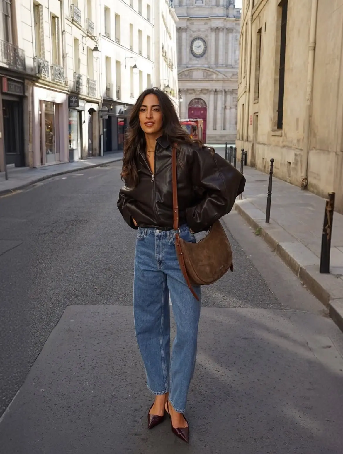 This outfit proves that Parisian style can be wonderfully approachable. A brown leather bomber jacket brings casual cool, paired with classic blue straight-leg jeans. Burgundy patent leather slingback heels add an unexpected pop of color and shine, while a brown suede crossbody bag keeps things hands-free and practical.