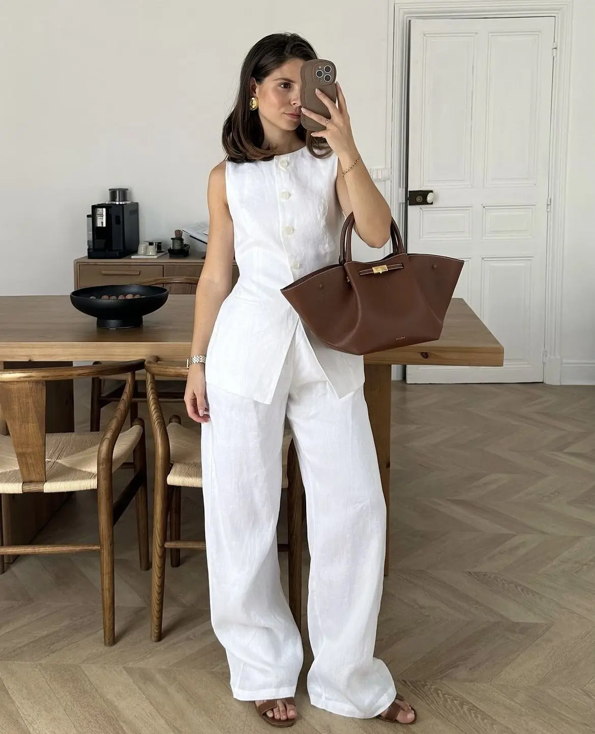 Nothing says spring in Paris quite like fresh white linen. This matching vest and wide-leg pants set creates an effortlessly elegant silhouette that’s both comfortable and chic. The brown structured bag adds a grounding element and prevents the all-white from feeling too stark or precious.