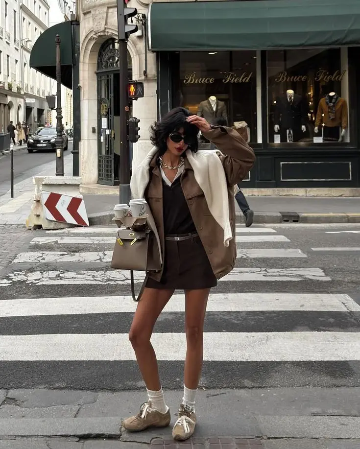 This outfit captures the playful side of Parisian dressing while maintaining that signature sophistication. A brown blazer creates structure and polish, layered over a brown polo that brings sporty-chic energy. A brown mini skirt keeps things youthful and fresh, while casual sneakers with white socks add an unexpected downtown edge.