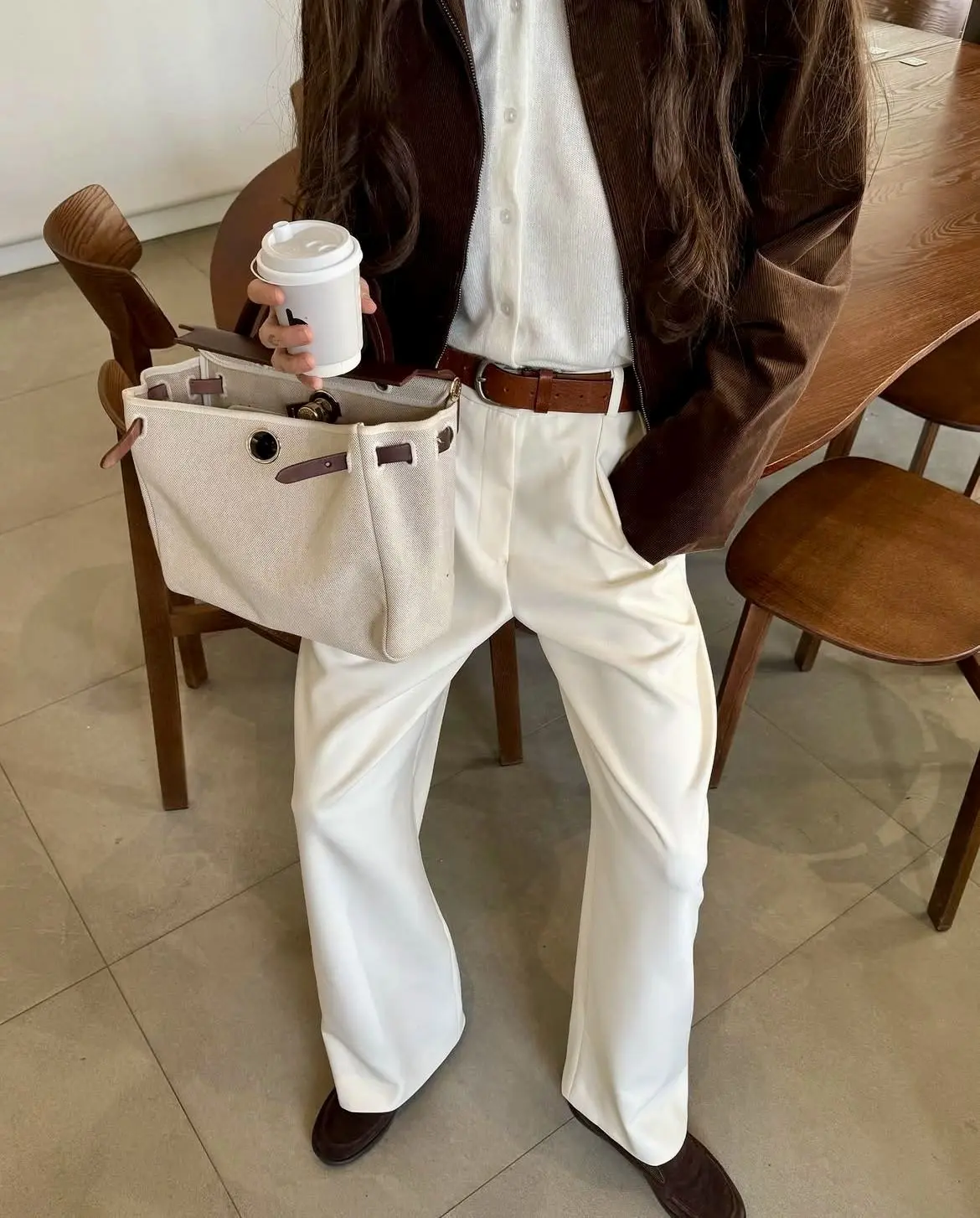 This outfit showcases the Parisian talent for sophisticated layering. A brown corduroy blazer white cardigan creates texture and dimension, paired with white wide-leg pants for a flowing, elegant silhouette. The canvas and leather bag adds a casual luxury touch that feels very Left Bank.