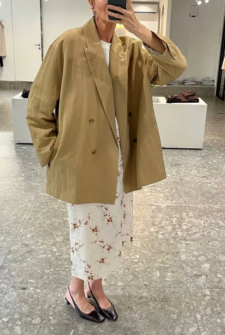 Styling Tip: The oversized trench over a feminine dress is a Parisian staple that works year-round but feels especially right in spring. The floral dress provides the softness and seasonal appropriate while the blazer adds structure and warmth. This combination transitions seamlessly from day to evening—just add a bold lip.